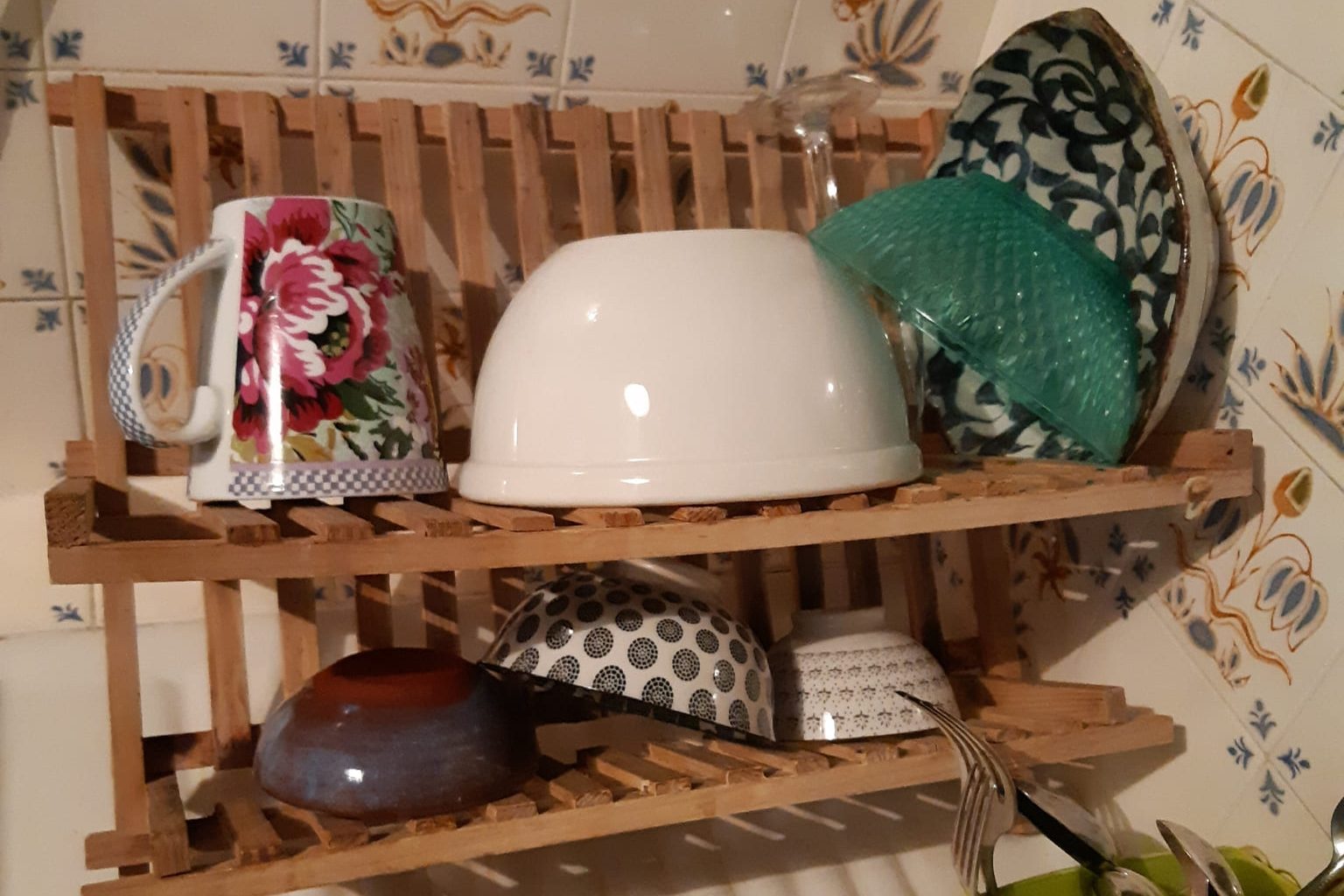 Je vais à la cuisine pour me faire un café, à côté de l’évier se trouve l’égouttoir avec, comme toujours, la vaisselle qui sèche en permanence, mais là… je la vois et je suis saisie, je me retrouve immobile à regarder ce tableau ! Il n’y a ni ordre ni méthode dans la façon dont la vaisselle est disposée, les bols de toute taille et de tout âge se mélangent et côtoient une tasse que l’on m’a offerte il y a bien longtemps, un verre à pied qui a beaucoup voyagé, et même le récipient en plastique dans lequel ma voisine m’a apporté deux œufs hier soir.
